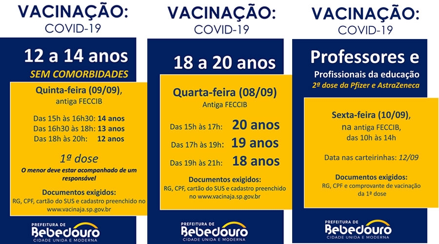 Após concluir a vacinação de todos os adultos de Bebedouro a partir de 18 anos, a Secretaria Municipal de Saúde dá andamento na vacinação de adolescentes, avança na aplicação de 2ª doses e imuniza as crianças a partir de 12 anos.