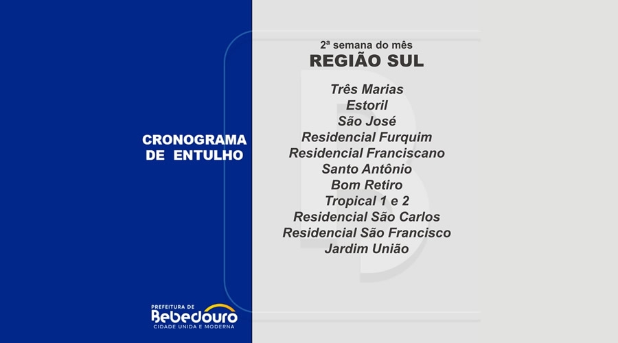 A Prefeitura de Bebedouro continua o trabalho de limpeza da cidade. Nesta semana, as equipes recolhem entulhos, galhos de árvores, grama e resíduos de construção na região sul.