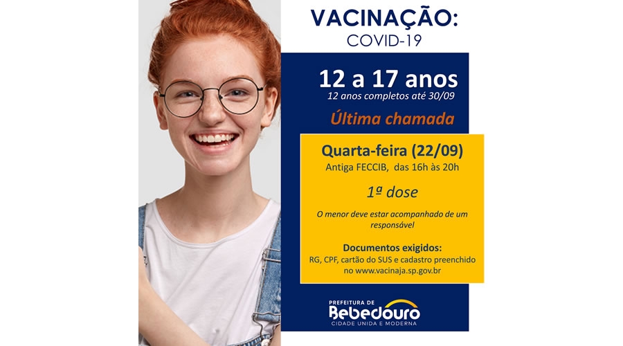 Quarta-feira (22/09) é dia de imunizar os adolescentes que perderam a data da vacina contra Covid-19 por algum motivo. Os faltosos de 12 a 17 anos vão receber a 1ª dose da Pfizer das 16h às 20h, na antiga Feccib. Serão imunizadas crianças que completam 12 anos até o dia 30 de setembro.