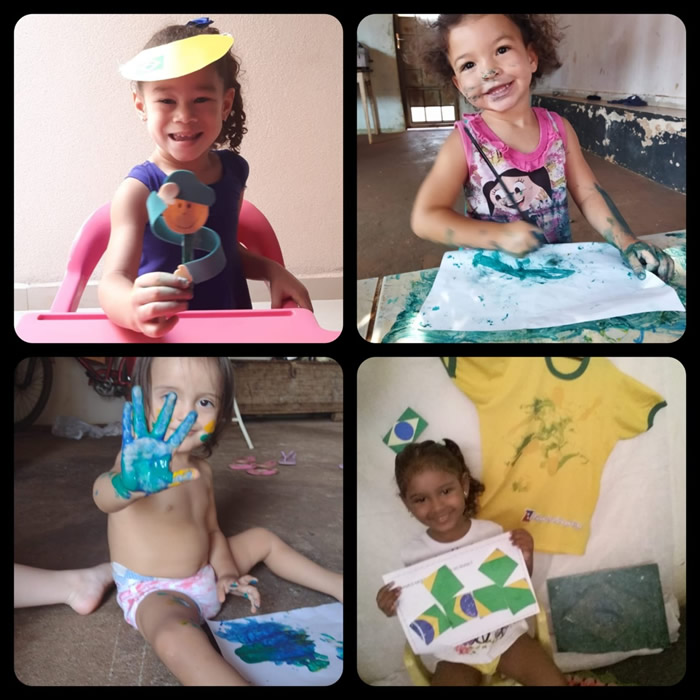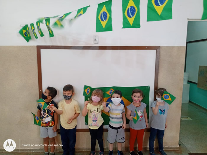 O patriotismo e a valorização do país foram retratados em desenhos sobre o contexto histórico. As crianças pintaram bandeira nacional e criação de brinquedos em verde e amarelo.