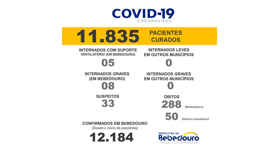 Até o momento, o município contabiliza 12.184 casos confirmados da Covid-19.