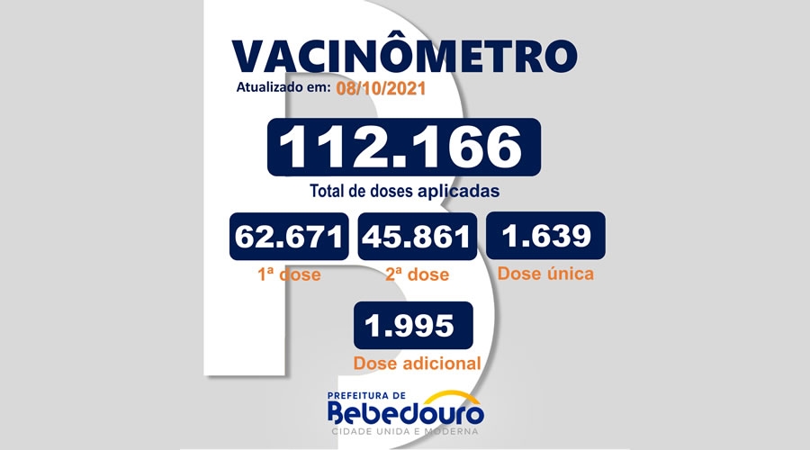 A vacinação avança em Bebedouro! Quase 100% da população com 12 anos ou + já recebeu a 1ª dose e 75,79% está com a imunização completa (2ª dose ou dose única). Mas a pandemia ainda não acabou: o distanciamento social, o uso de máscaras e álcool gel ainda salvam vidas!