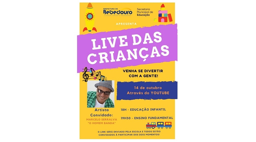 Os eventos com grandes aglomerações ficaram para os próximos meses, mas a Secretaria Municipal de Educação de Bebedouro (SEMEB) preparou uma programação diferenciada para o Dia das Crianças. O músico Marcelo Serralva, mais conhecido como Tio Marcelo, irá animar a Live das Crianças na próxima quinta-feira (14).