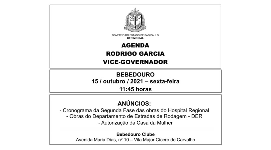ATENÇÃO: alteração | Vice-governador Rodrigo Garcia anuncia obras em Bebedouro, na sexta-feira (15)