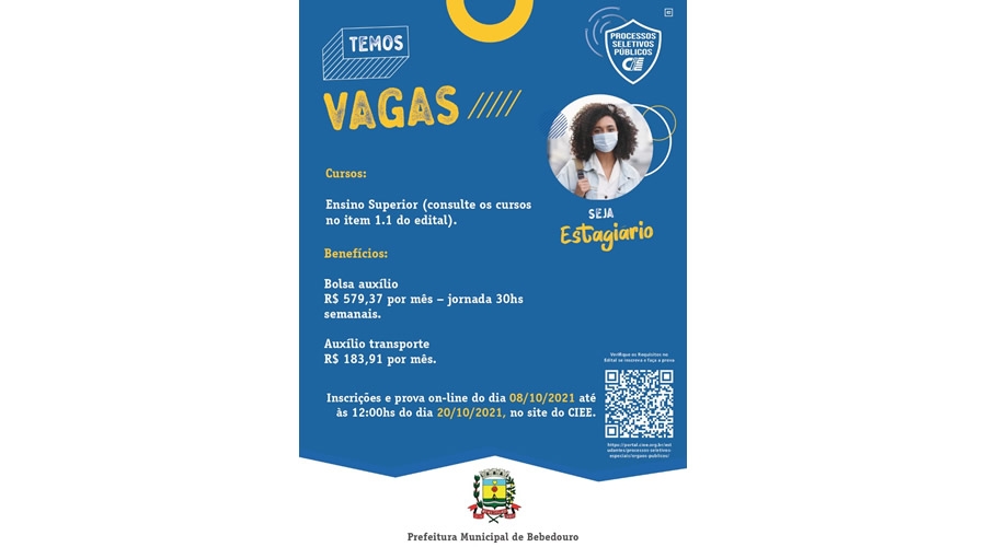 A Prefeitura de Bebedouro finaliza nesta quarta-feira (20) as inscrições para a contratação de estagiários de cursos superiores, que vão atuar em diversos setores da prefeitura. Os interessados terão até ás 12h para se inscreverem no site do Centro de Integração Empresa Escola (CIEE).