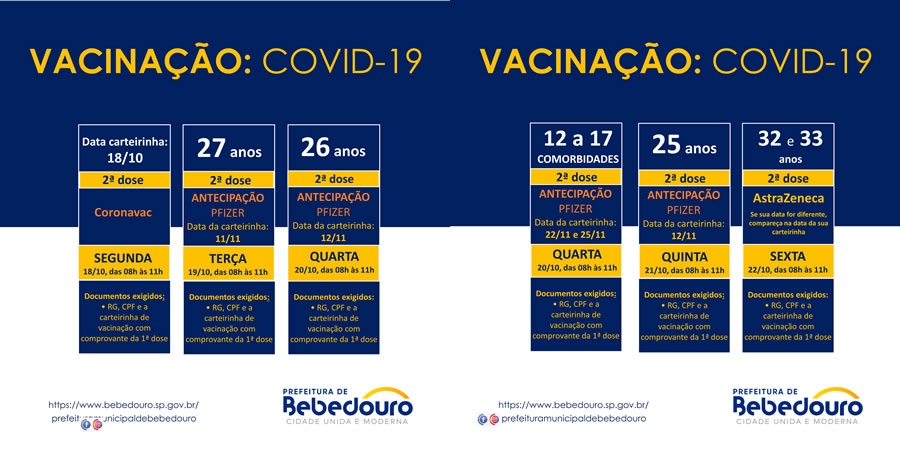 É necessário obedecer a data de cada carteirinha. "A maioria das pessoas foram vacinadas em mutirões, ou seja, a 2ª dose também será em mutirão. Se a data da sua carteirinha for diferente, compareça na Feccib na data que consta na sua carteirinha", reforça a secretária de Saúde, Silvéria Laredo.