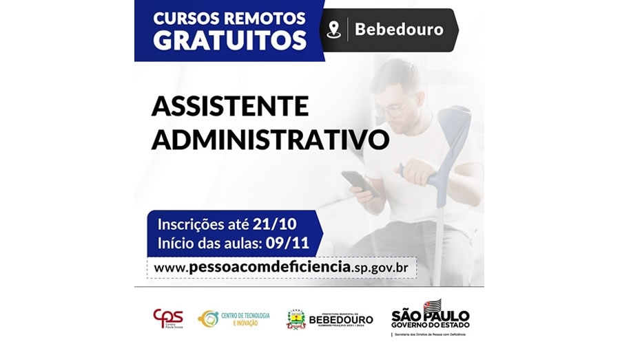 As pessoas com deficiência de Bebedouro terão oportunidade de participar de mais uma atividade de qualificação profissional. O curso remoto de Assistente Administrativo é gratuito, realizado por meio da parceria entre a Secretaria de Estado dos Direitos da Pessoa com Deficiência, o Centro Paula Souza, o Centro de Tecnologia e Inovação e a Prefeitura de Bebedouro. A inscrição segue até o dia 21 de outubro.