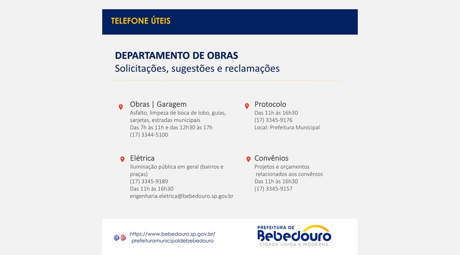 A Prefeitura de Bebedouro quer ouvir e atender a população. Um dos setores mais procurados, o Departamento de Obras e Convênios possui vários canais de comunicação com os moradores, que podem dar sugestões, fazer solicitações e reclamações pessoalmente, por telefone ou por e-mail.
