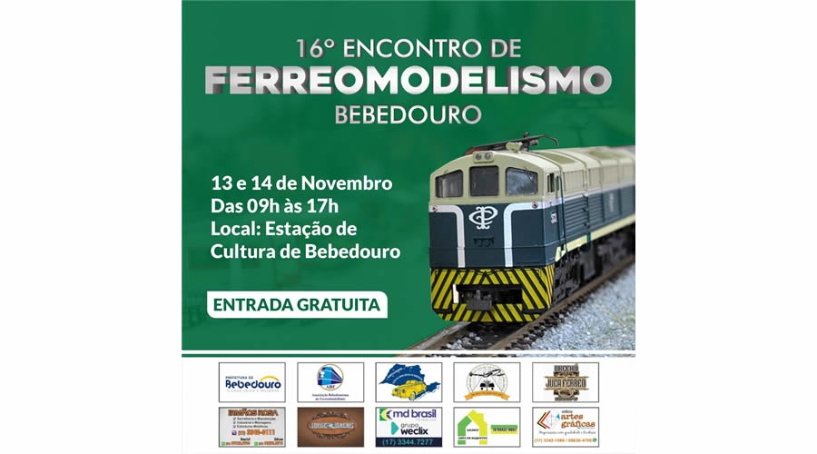 Os amantes do ferreomodelismo já podem se preparar para visitar Bebedouro. A Associação Bebedourense de Ferreomodelismo e Memória Ferroviária, em parceria com a Prefeitura Municipal, realiza o maior evento da modalidade na América Latina. A 16ª edição acontece das 09h às 17h, na Estação Cultura.