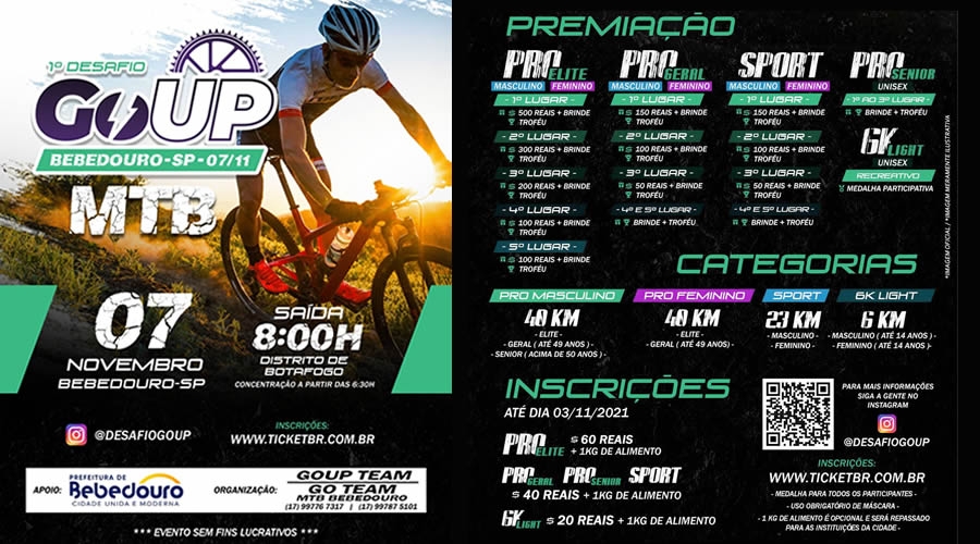 O evento será chipado e terá no máximo de 250 inscritos. Os interessados devem se inscrever no site www.ticketbr.com.br. “Os ciclistas/turistas vão conhecer e se encantar por Bebedouro. Muitos irão voltar, trazer a sua família para passear e comprar no nosso comércio. É um evento que irá reunir atletas de toda a região e dará visibilidade para a cidade”, diz o prefeito Lucas Seren, que apoia a iniciativa.
