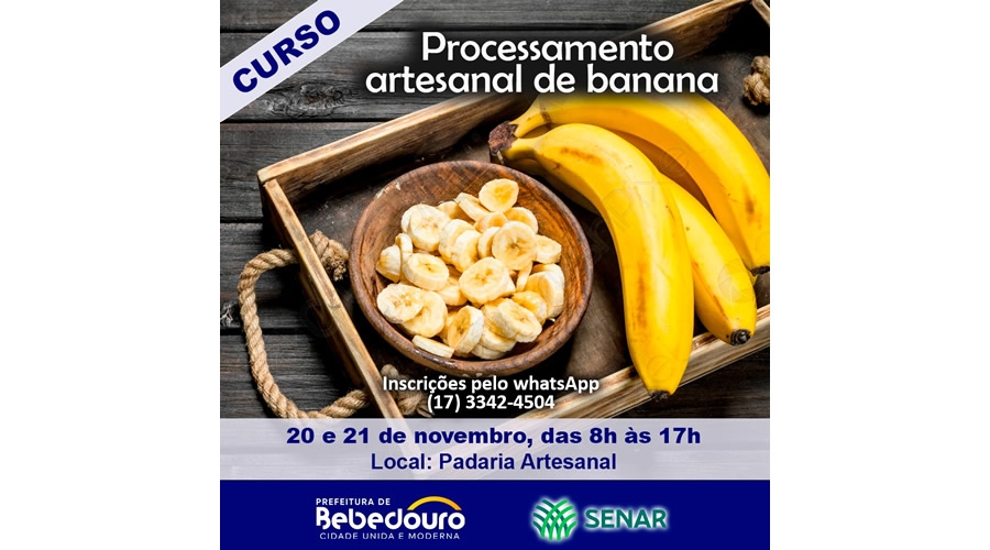 O Fundo Social de Solidariedade (FSS), em parceria com o Sindicato Rural de Bebedouro e SENAR, está com inscrições abertas para o curso de Processamento Artesanal de Banana. Os interessados em se inscrever devem entrar em contato pelo whatsApp (17) 3342-4504.