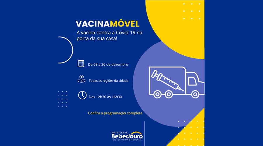 A Secretaria Municipal de Saúde traçou novas estratégias para ampliar a cobertura vacinal contra a Covid-19 em Bebedouro, especialmente na aplicação da 2ª dose e dose acional. O vacimóvel irá percorrer as ruas de todos os bairros até o dia 30 de dezembro, das 12h30 às 16h30.