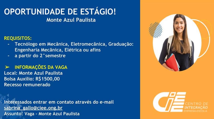 O Centro Integrado Empresa Escola (CIEE) está com as inscrições abertas para a contratação de estagiários dos cursos de tecnólogo em mecânica, eletromecânica, graduação: engenharia mecânica, elétrica ou afins. Os currículos serão recebidos até às 17h de terça-feira (21).