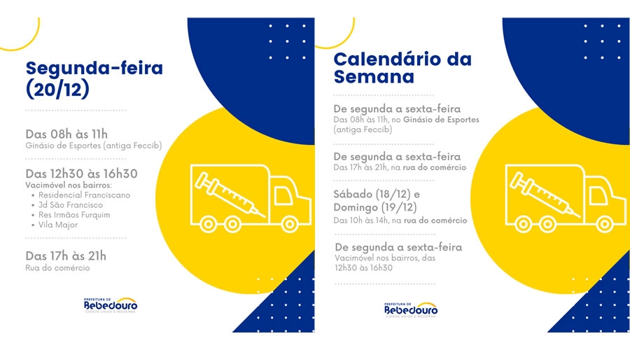 O vacimóvel está percorrendo as ruas da cidade. “Ampliamos os horários e os pontos fixos. Pela manhã vacinamos na antiga Feccib, a tarde passamos pelos bairros e a noite vamos até a rua do comércio. Bebedouro tem vacinação das 08h às 22h, com pequenos intervalos. Somente com a 2ª dose e dose adicional vamos conseguir salvar vidas. Esperamos todos vocês”, convoca a secretária da pasta, Silvéria Lâredo.