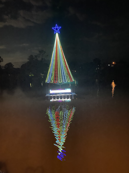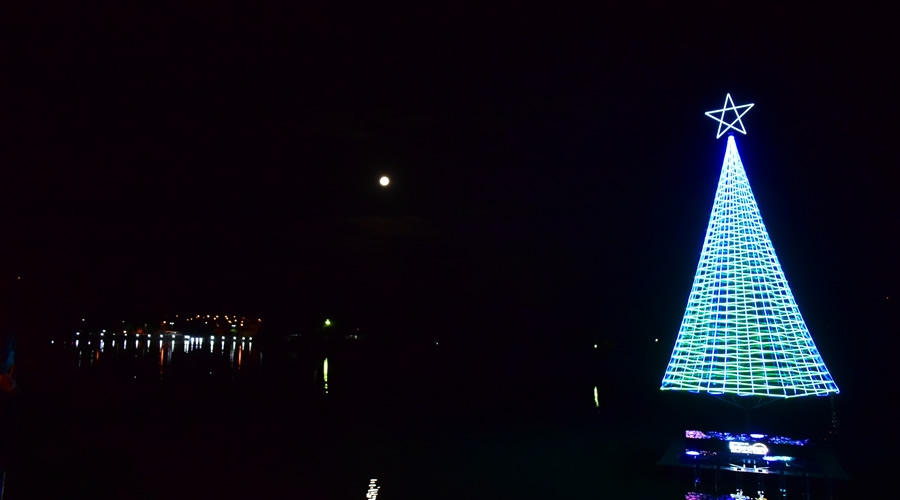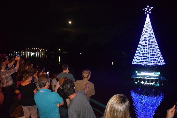 O Natal Luz está ainda mais especial em Bebedouro. Uma belíssima árvore flutuante de 20 metros de altura, com sistema de som e luzes de led foi instalada neste sábado (18) e completa a paisagem do Lago Artificial. As luzes serão acessas todos os dias a partir das 19h.