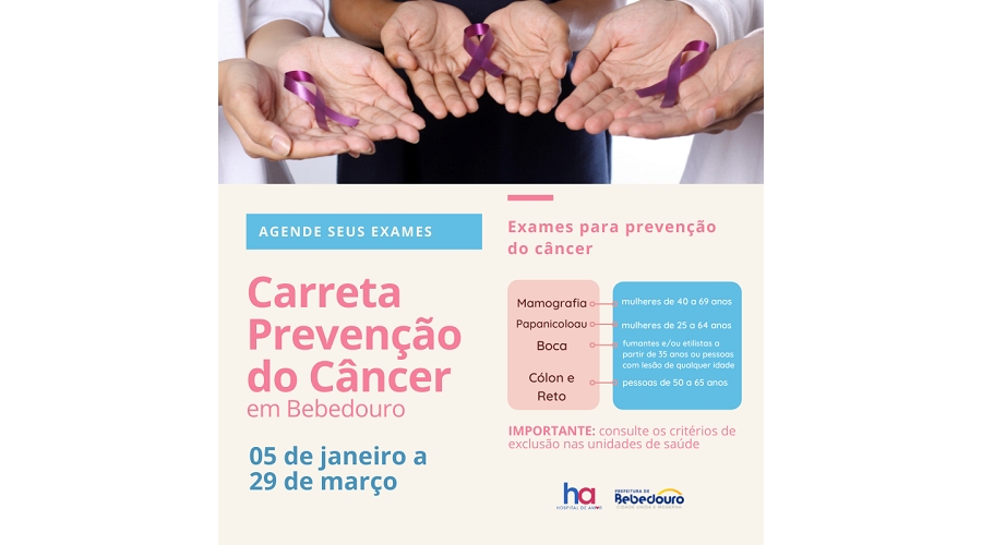 A Secretaria Municipal de Saúde de Bebedouro preparou uma extensa programação para realizar exames de prevenção ao câncer de mama, útero, boca, cólon e reto. A carreta móvel do Hospital de Amor de Barretos ficará estacionada em frente as unidades de saúde de 05 de janeiro a 29 de março.
