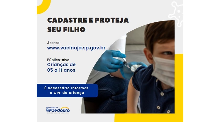 Bebedouro está preparada para imunizar as crianças contra a Covid-19. Nesta semana, serão contempladas as de 08 a 11 anos com comorbidades ou deficiências. A aplicação acontece de terça (18) a sexta-feira (21), na Escola Paraíso Cavalcanti, das 17h às 20h. Os pais ou responsáveis devem cadastrar no site https://vacinaja.sp.gov.br .