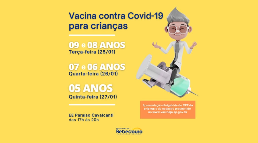 A Secretaria Municipal de Saúde conclui a vacinação de todas as crianças de 05 e 11 anos nesta semana. Os pais ou responsáveis devem comparecer na Escola Paraíso Cavalvanci, das 17h às 20h (ver programação).