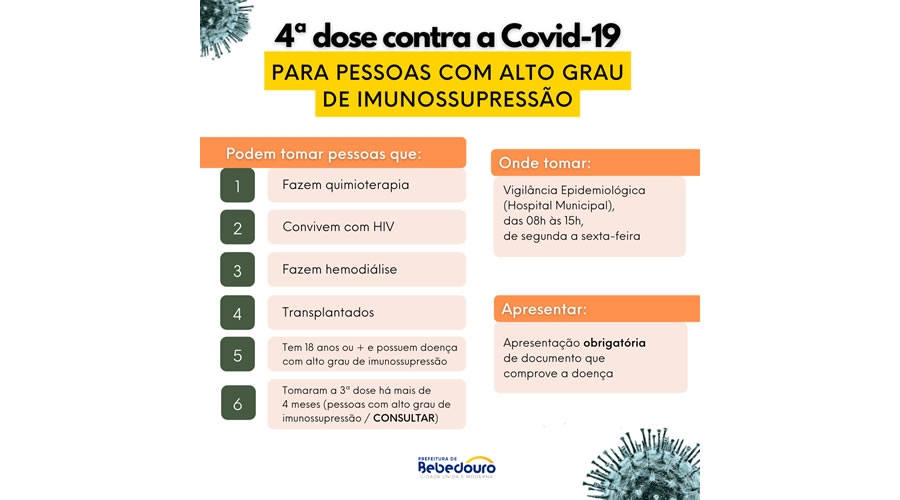 A Prefeitura de Bebedouro já está aplicando a 4ª dose para as pessoas que apresentam alto grau de imunossupressão (consultar abaixo). Os pacientes devem procurar a Vigilância Epidemiológica (Hospital Municipal) de segunda a sexta-feira, das 08h às 15h. A apresentação de documento que comprove a doença é obrigatória.