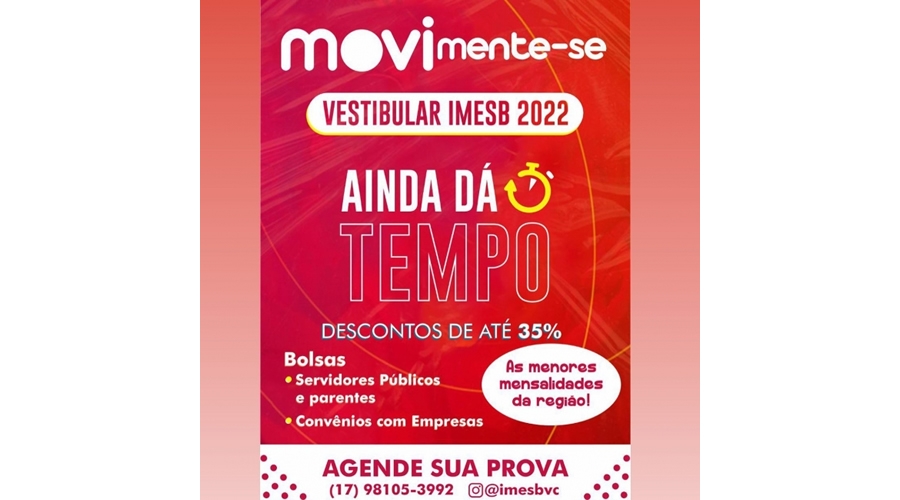 O IMESB (Faculdade Municipal de Bebedouro), ainda está com inscrições abertas para as provas agendadas do Vestibular 2022. Os interessados podem fazer o agendamento por meio do telefone (17) 3345-9366, ou pelo nosso WhatsApp (17) 98105-3992 de segunda a sexta-feira, das 8h às 22h, e definir o melhor dia e o horário. A inscrição é gratuita e segue até o dia 21 de fevereiro.