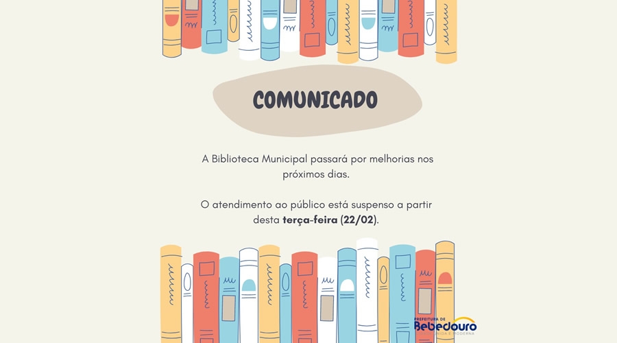 O Departamento Municipal de Cultura informa que a Biblioteca Municipal passará por melhorias nos próximos dias[LV1] . O atendimento está suspenso a partir desta terça-feira (22/02).