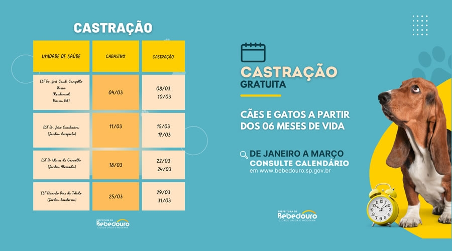 É cadastro prévio, com apresentação de cópias do RG, CPF, comprovante de renda e residência. “Cães e gatos podem ser castrados a partir dos 06 meses de vida. Vamos dar preferência na castração de fêmeas para o melhor controle da natalidade. É importante estar atento e procurar a unidade de saúde para o cadastro na data correta”, informa a coordenadora do setor, Regina Melanda.