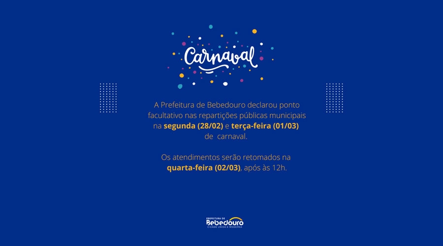 A Prefeitura de Bebedouro declarou ponto facultativo nas repartições públicas municipais na segunda (28/02) e terça-feira (01/03), durante o carnaval. Os atendimentos serão retomados na quarta-feira (02/03), após às 12h.