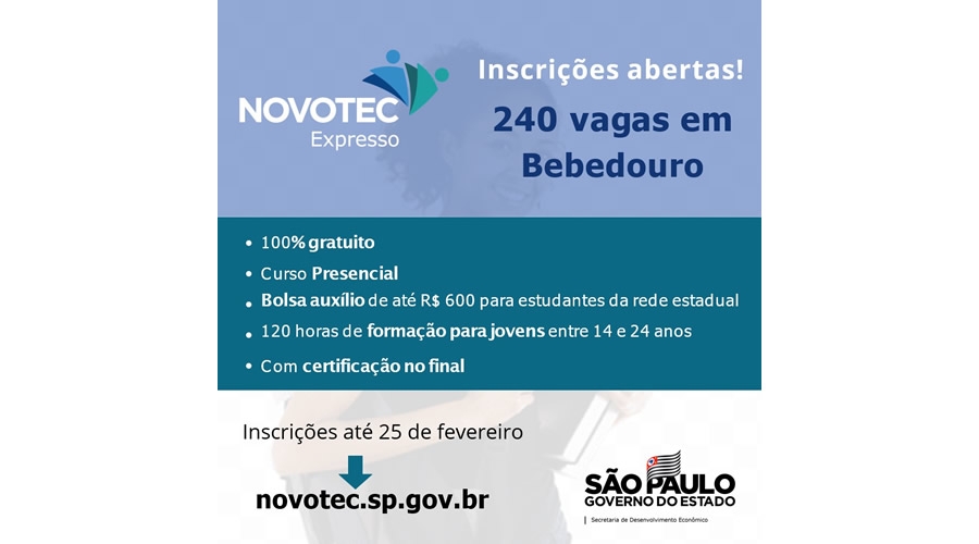 A Prefeitura de Bebedouro e o Governo do Estado de São Paulo estão empenhados em oferecer qualificação profissional para uma das faixas etárias que mais sofre para se estabelecer no mercado de trabalho - jovens de 14 a 24 anos. O programa Novotec Expresso oferece cursos que atendem as demandas atuais do mercado, os interesses dos jovens e as necessidades das empresas de Bebedouro. Interessados devem se inscrever no site www.novotec.sp.gov.br