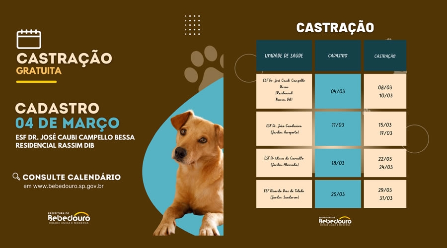 É cadastro prévio, com apresentação de cópias do RG, CPF, comprovante de renda e residência. “Cães e gatos podem ser castrados a partir dos 06 meses de vida. Vamos dar preferência na castração de fêmeas para o melhor controle da natalidade. É importante estar atento e procurar a unidade de saúde para o cadastro na data correta”, informa a coordenadora do setor, Regina Melanda.