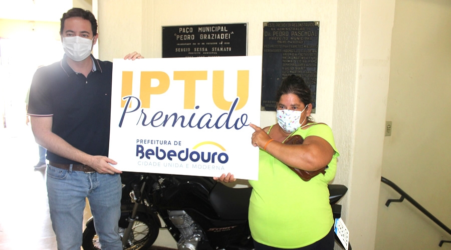 Pagar o IPTU em dia rende prêmios em Bebedouro. O prefeito Lucas Seren entregou uma motocicleta 160 CG para Marilsa Francisca de Andrade, moradora do Jardim Itália, nesta segunda-feira (07). O sorteio da campanha “IPTU Premiado 2021” foi realizado pela Loteria Federal em 05 de janeiro.