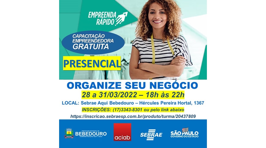 A Prefeitura de Bebedouro e o SEBRAE estão com inscrições abertas para o curso gratuito de ‘Capacitação empresarial para empreendedores formalizados como MEI’. As vagas são limitadas. Os interessados podem se inscrever de segunda a sexta-feira, das 9h às 17h, pelo telefone/whatsApp (17) 3343-8301.