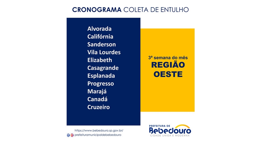 A Prefeitura de Bebedouro continua o trabalho de limpeza da cidade. Nesta semana, as equipes recolhem entulhos, galhos de árvores, grama e resíduos de construção na região oeste.