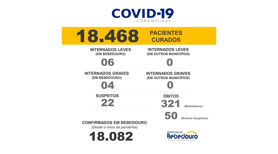 A Prefeitura de Bebedouro informa que foram confirmados 176 curados, 173 positivos e 133 casos negativos nesta sexta-feira (25).
