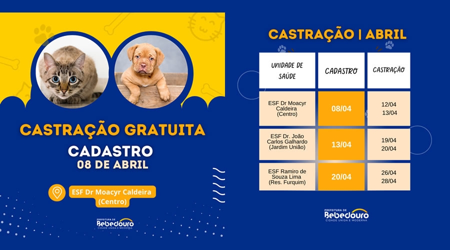 É cadastro prévio, com apresentação de cópias do RG, CPF, comprovante de renda e residência. “Cães e gatos podem ser castrados a partir dos 06 meses de vida. Vamos dar preferência na castração de fêmeas para o melhor controle da natalidade. É importante estar atento e procurar a unidade de saúde para o cadastro na data correta”, informa a coordenadora do setor, Regina Melanda.