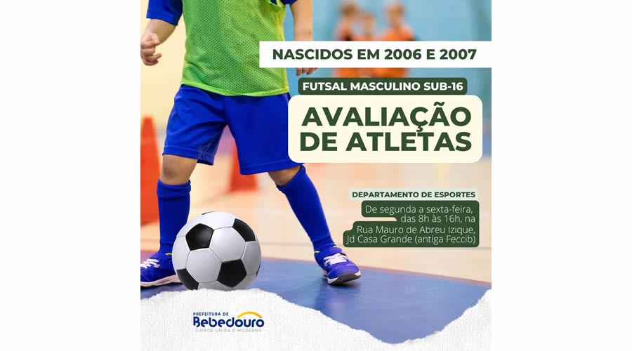 O Departamento Municipal de Esportes (DME) informa que estão abertas as inscrições gratuitas para a avaliação de atletas para formação da equipe de futsal masculina Sub-16, nascidos em 2006 e 2007.