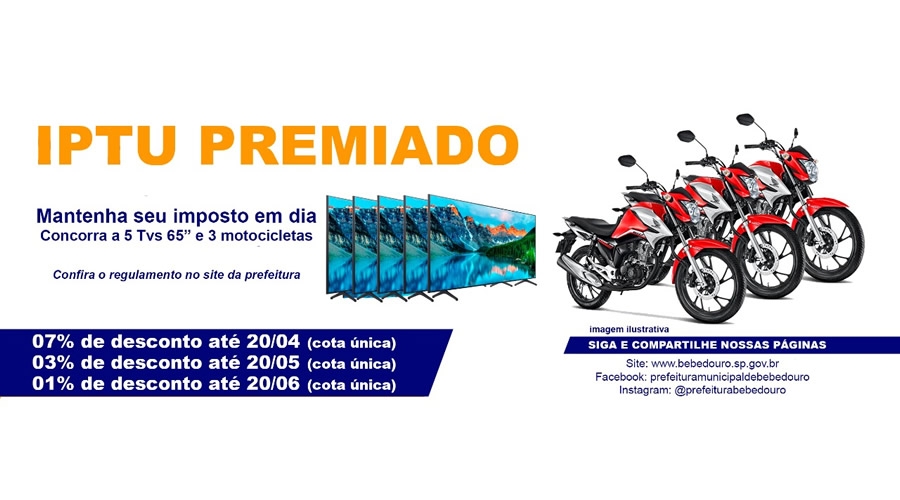 Pagar o IPTU em dia é um ótimo negócio em Bebedouro. A prefeitura irá sortear ao longo do ano cinco TVs de 65" e três motos 160cc aos contribuintes adimplentes. O vencimento da primeira parcela ou da parcela única com 7% de desconto será no dia 20 de abril.