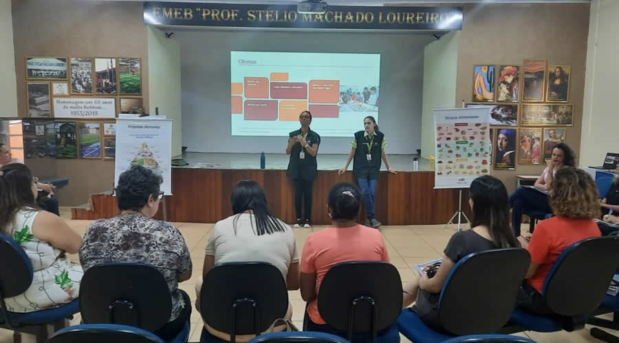 As coordenadoras da educação infantil da Secretaria Municipal de Educação de Bebedouro (SEMEB) participaram de uma nova formação do projeto ‘Comer e brincar na escola’. O treinamento foi ministrado nesta terça-feira (12) pelas voluntárias Ana Paula e Vitória, em uma parceria com o Instituto Avisa Lá e Cargill, na EMEB Professor Stélio Machado Loureiro.