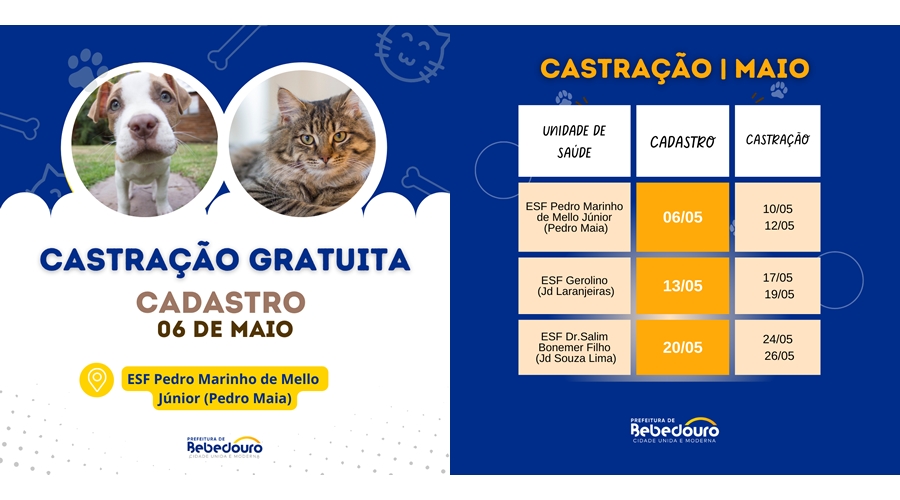 É necessário fazer um cadastro prévio, com apresentação de cópias do RG, CPF, comprovante de renda e residência. “Cães e gatos podem ser castrados a partir dos 06 meses de vida. Vamos dar preferência na castração de fêmeas para o melhor controle da natalidade. É importante estar atento e procurar a unidade de saúde para o cadastro na data correta”, informa a coordenadora do setor, Regina Melanda.