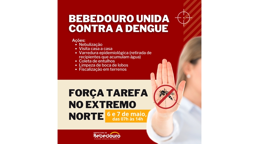 A Prefeitura de Bebedouro reuniu profissionais de vários setores e preparou uma grande força tarefa para combater o mosquito Aedes aegypti nas próximas semanas. As equipes começam pelo extremo norte, na sexta-feira (06/05) e no sábado (07/05), das 07h às 14h.