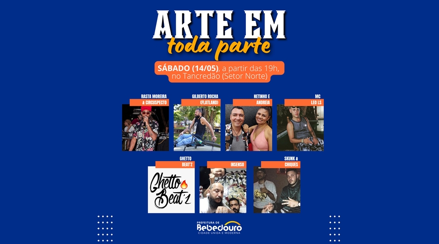 O Tancredão será palco de vários artistas de Bebedouro. Os moradores do setor norte terão à disposição artesanato, dreads, terrário e muitos shows a partir das 19h deste sábado (14/05). O projeto “Arte em toda Parte” leva apresentações artísticas e musicais para os bairros em comemoração aos 138 anos da cidade.