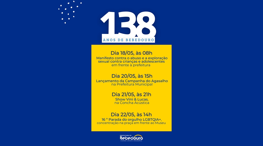Show Vini & Lucas, lançamento da Campanha do Agasalho, 16 º Parada do orgulho LGBTQIA+ Bebedouro e o manifesto contra o abuso e a exploração sexual contra crianças e adolescentes marcam a comemoração dos 138 anos de Bebedouro nesta semana.