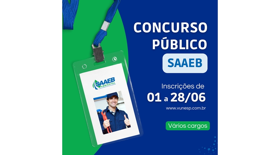 O Serviço Autônomo de Água e Esgoto de Bebedouro (SAAEB) publicou o edital para o concurso público que será realizado pela Fundação VUNESP. Os interessados em concorrer as 26 vagas para cargos de níveis fundamental, médio e superior devem se inscrever de 01 a 28 de junho exclusivamente pela internet no site www.vunesp.com.br.