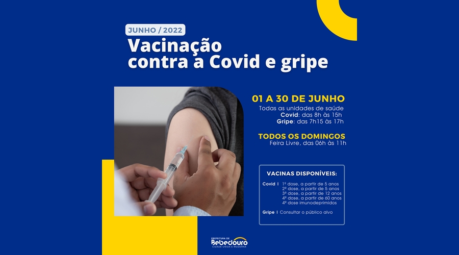 A Secretaria Municipal de Saúde continua a vacinação de todas as pessoas a partir de 05 anos contra a Covid-19 e um público específico contra a Gripe (consultar tabela das vacinas disponíveis).