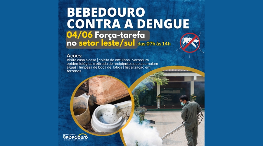 A força tarefa da Prefeitura de Bebedouro está avançando para novos bairros. A equipe da Secretaria Municipal de Saúde irá atuar no setor leste a partir deste sábado (04/06). A varredura epidemiológica acontece das 07h às 14h, no Pedro Maia, Hércules Hortal, Candinho e Centenário.