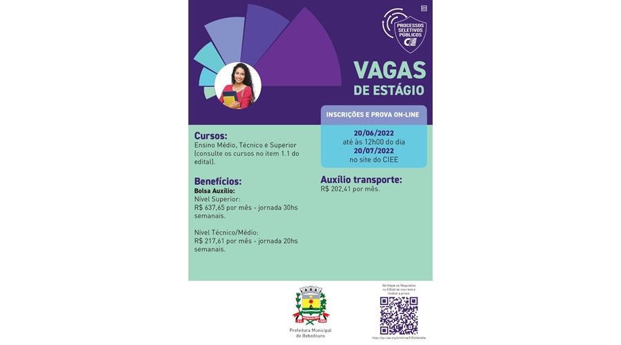 O Centro Integrado Empresa Escola (CIEE) abriu inscrições para preenchimento de vagas de estágio na Prefeitura de Bebedouro para estudantes de nível superior, cursos técnicos e Ensino Médio. As vagas são para cadastro reserva. O prazo se encerra às 12h do dia 20 de julho.
