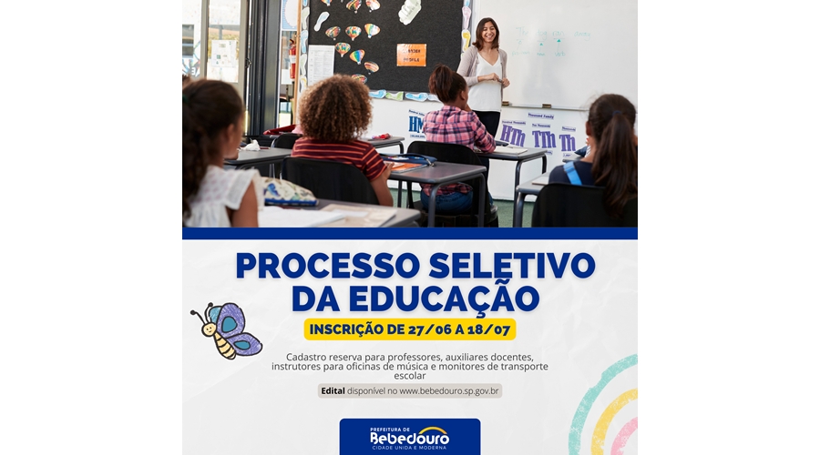 A Secretaria Municipal de Educação de Bebedouro (SEMEB) irá contratar professores, auxiliares docentes, instrutores para oficinas de música e monitores de transporte escolar. Os interessados devem se inscrever de 27 de junho a 18 de julho pelo site www.gamaconsult.com.br.