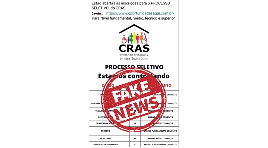 A Prefeitura de Bebedouro informa que a mensagem que circula nas redes sociais sobre um processo seletivo para o Cras é FAKE NEWS.