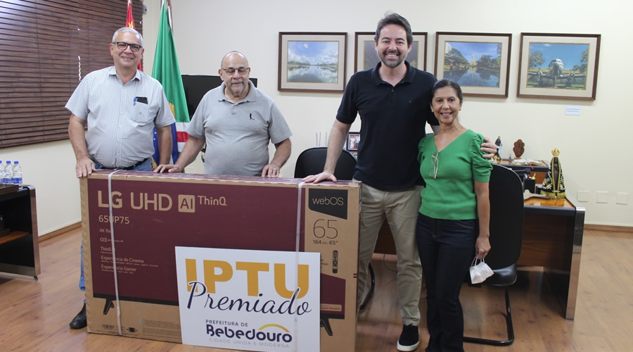 A Prefeitura de Bebedouro dá continuidade a edição 2022 da campanha “IPTU Premiado”. A entrega de mais uma Smart TV 65 polegadas foi realizada nesta segunda-feira (27). O segundo sorteio realizado pela Loteria Federal contemplou Jorge Luiz Luz, residente no imóvel localizado no Parati 2.