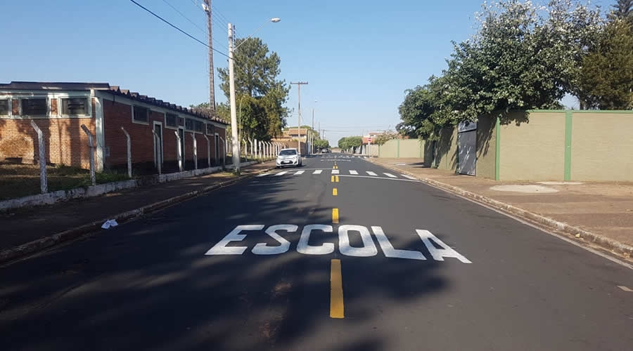 No Jardim Alvorada, a equipe reforçou a sinalização de solo na Alameda Joaquim Luís Vizicato, em frente à Escola Estadual Orlando França de Carvalho.