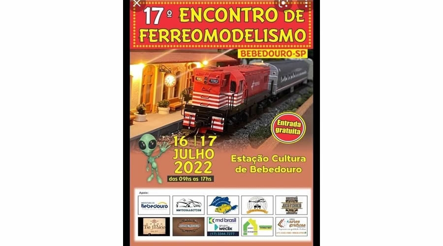 A Estação Cultura novamente será palco do tradicional Encontro de Ferreomodelismo. O evento promovido pela Associação Bebedourense de Ferreomodelismo em parceria com a Prefeitura de Bebedouro, reunirá belíssimas réplicas em miniatura, como trens, carros, cidades, bicicletas, motocicletas, aviões e navios. O encontro tem entrada gratuita e será realizado no sábado (16) e domingo (17), das 9h às 17h.